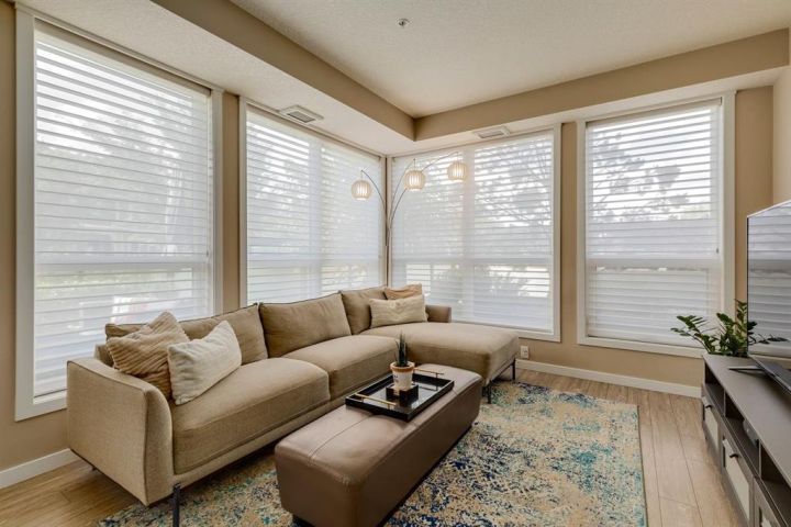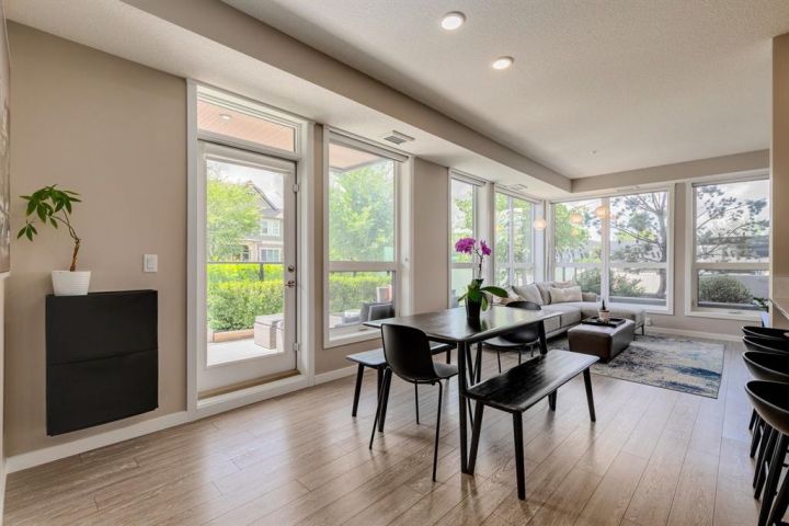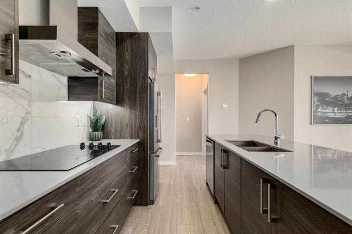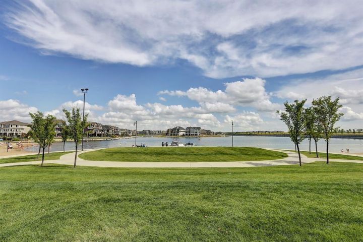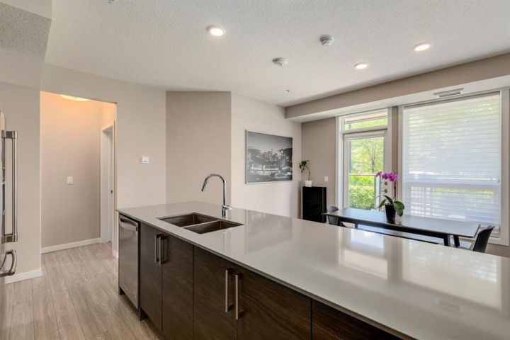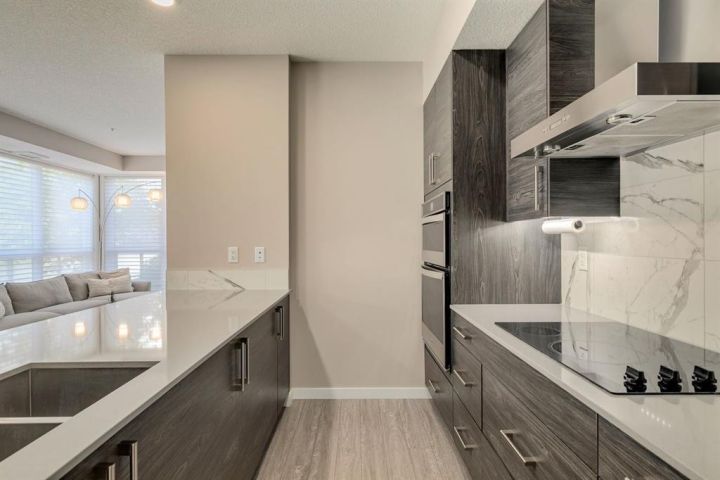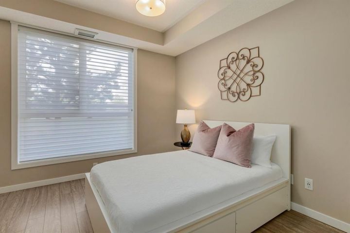 OPEN HOUSE - Saturday, Oct 4, 1:00-3:00 - Lake Living in Mahogany is the dream but we kick it up a notch when living at Westman Village ~ Experience elevated, resort-style living in the heart of Westman Village with this beautifully appointed 2-bedroom, 2-bathroom main floor corner air conditioned unit. Perfectly positioned just steps from the adjacent West Beach and the Mahogany boardwalk, this rare offering blends luxury, comfort, and an unbeatable location within one of Calgary’s most amenity-rich lake communities. ~ Spanning 1040 sq ft, this air-conditioned home features 9-foot ceilings, wide-plank luxury vinyl flooring, and an abundance of natural light thanks to its corner-unit layout and additional windows throughout. The modern kitchen showcases sleek cabinetry, quartz countertops, and a stylish neutral colour palette that flows seamlessly into the bright and open living area. From both the living room and the expansive patio, enjoy subtle views of Mahogany Lake and beautifully landscaped courtyard gardens. The oversized, private patio is large and semi private — an ideal extension of your living space, complete with privacy glass and lush greenery, perfect for morning coffee, dining al fresco, or relaxing in the sun. The oversized primary suite is a true retreat, featuring ample space for a sitting area or workspace, custom closets with built-in organizers, and a private 3-piece ensuite with modern fixtures and finishes. The spacious second bedroom includes a walk-in closet and a large window, with easy access to the second full 4-piece bathroom—ideal for guests or flexible use. Additional conveniences include in-suite laundry and a large in-suite storage room. AND you have a separate Storage Locker (rare) purchased from developer. This home also includes a titled underground parking stall and access to Westman Village’s world-class amenities. The 40,000+ sq ft Village Centre offers a lifestyle unlike any other, including a fitness facility, indoor pool, walking track, golf simulator, gymnasium, wine room, library, art studio, and more. Residents also enjoy a dog wash, car wash bay, guest suites, and 24-hour on-site security. But what truly sets this location apart is its immediate proximity to West Beach—with sandy shores, lake access, and endless recreational opportunities just out your front door. Within the village, you’re steps from boutique retail, a full-service pharmacy, and some of Calgary’s best dining: enjoy brunch at Diner Deluxe, fine dining at Chairman’s Steakhouse, cocktails and live music at Alvin’s Jazz Club, or a casual night out at Mash. Start your mornings with Analog Coffee, located just around the corner. This is your opportunity to enjoy the best of lake living with all the benefits of a low-maintenance, lock-and-leave lifestyle. Book your private showing today and discover how life at Westman Village truly feels like a resort—every single day.