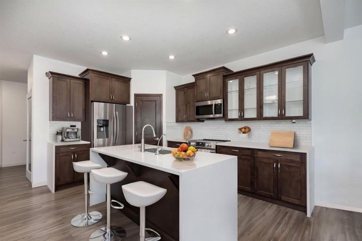 Welcome to your dream home in Auburn Bay — a fully finished, Cedarglen-built two-storey offering over 3,000 sq ft of impeccably curated living space across all three levels. Perfectly situated across from a sprawling green space and Lakeshore School in one of Calgary’s most beloved lake communities, this home masterfully blends luxury, functionality, and timeless design. Step inside to a bright, open-concept main floor where luxury vinyl plank flooring runs wall-to-wall — no carpet in sight. The chef-inspired kitchen is the heart of the home, featuring a dramatic white quartz waterfall island, full stainless steel appliance package, rich espresso cabinetry, tiled backsplash, and a corner pantry. The adjacent dining area and inviting great room, anchored by a stone-wrapped gas fireplace, offer the ideal setting for entertaining or everyday family living. A private main floor den, built-in mudroom lockers, and a stylish 2-piece bath complete the level. Upstairs, the nearly 200 sq ft primary suite is a true retreat, complete with a spa-like 5-piece ensuite and walk-in closet. Two additional bedrooms offer custom built-in closets, while a spacious 518 sq ft bonus room—complete with sliding barn doors and a private balcony—offers flexible space for a fourth bedroom, playroom, or home office. A full 4-piece bath and upper-level laundry room add thoughtful convenience. The professionally finished basement adds even more versatility, featuring spray foam insulation, upgraded subfloor, a large rec room with pot lights and wet bar (with built-in bar fridge), a stylish 4-piece bathroom with dual sinks and rainfall shower, and electrical and framing prepped for a future fourth bedroom. Outside, enjoy a private and beautifully landscaped backyard with mature cherry blossom trees, a custom pergola with roll-down privacy shades, and a gas line for your BBQ — perfect for warm summer evenings. The oversized double garage is insulated and painted, rounding out this exceptional package. Located in a premier 4-season lake community, enjoy exclusive access to paddleboarding, kayaking, swimming, skating, tennis courts, and the Auburn House facility. Minutes to schools, shopping, South Health Campus, and with a new public middle school coming soon just steps away — this is a rare opportunity not to be missed. A luxurious home. A vibrant lifestyle. Welcome to Auburn Bay.