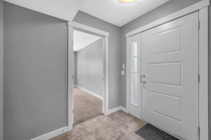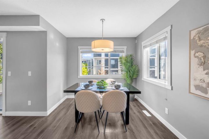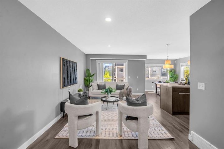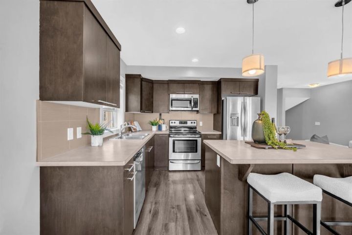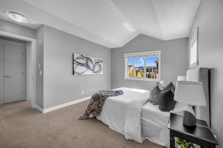 Welcome to this beautifully maintained CORNER unit offering exceptional space and convenience in Redstone. Featuring 4 spacious bedrooms and 2.5 bathrooms, this home is perfect for families or anyone seeking extra room to grow. The bright, open layout is FRESHLY PAINTED and PROFESSIONALLY CLEANED, providing a true move-in ready experience. The main floor consists of a large foyer with access to the garage and bedroom. The second floor features a bright, open layout living area featuring a beautiful kitchen with upgraded stainless steel appliances and island. The open layout of the kitchen, sizeable centre island, dining room and living room make it perfect for entertaining. The huge patio area easily fits a small patio set to sit and relax with a natural gas line hook up ready for your bbq. The upper floor features a huge master bedroom with a VAULTED CEILINGS, walk-in closet and attached ensuite. There are 2 more spacious bedrooms and a full bathroom on the top floor. Enjoy the convenience of an attached single garage plus full driveway, giving you ample parking and storage. With its corner location, this home also benefits from extra windows and natural light throughout. Located in a very quiet location across a park in a family oriented community of Redstone! This home is close to all amenities like bus stop, stores, mall, airport, bus stop, groceries and easy access to Stoney Trail and Deerfoot. Steps away from a new shopping plaza opening on Redstone Blvd!