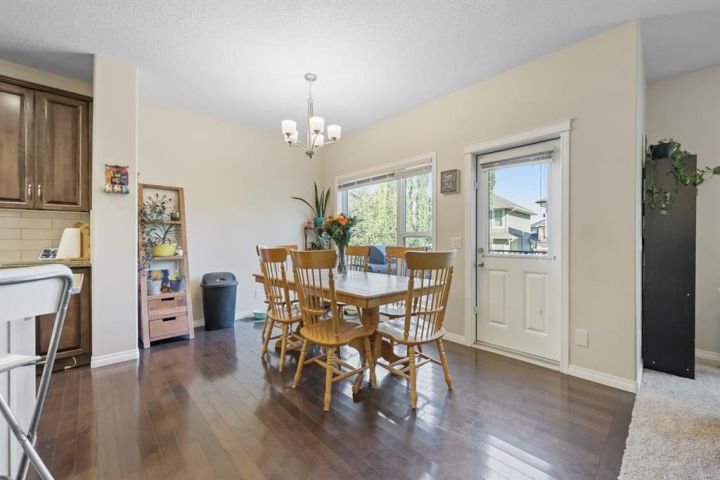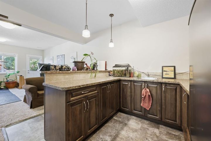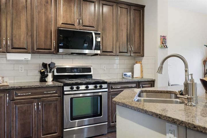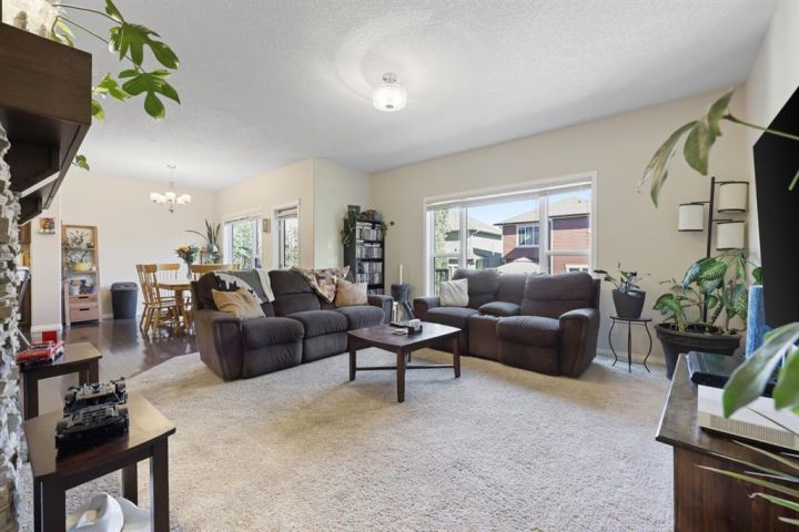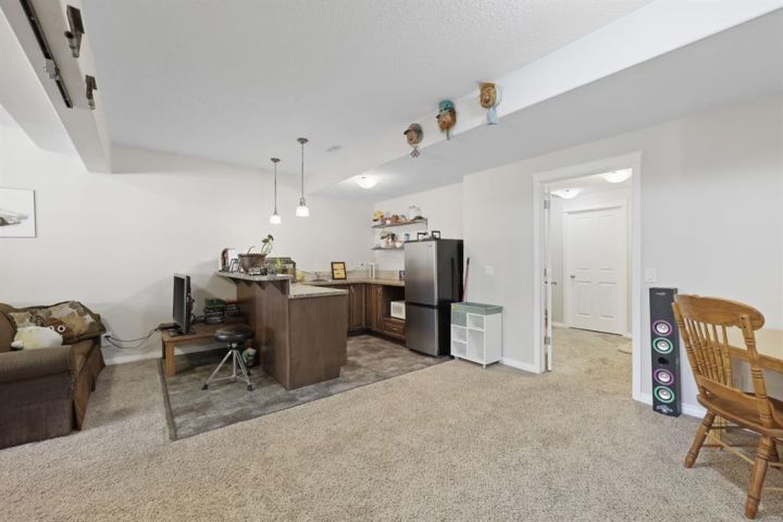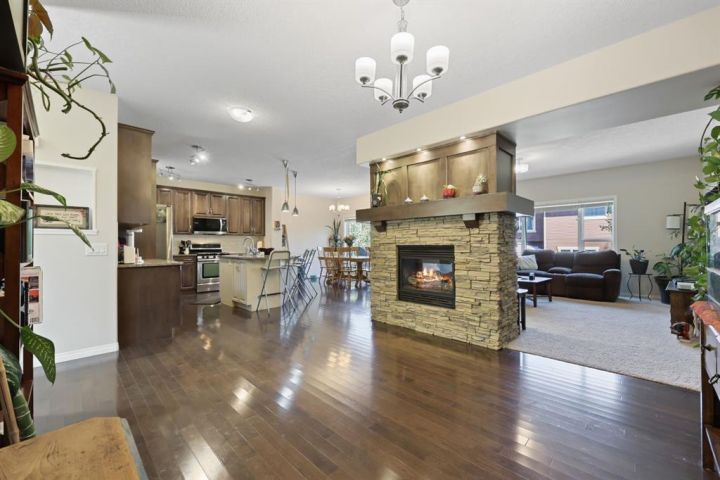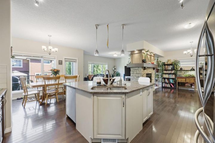 This executive two story walkout home has 3 bedrooms, laundry, and a family room on the upper level with large windows to let in lots of natural light. The main floor features an open concept layout with a kitchen hosting granite countertops, a walk though pantry a spacious living room and a formal dining room, all enhanced by a double sided gas fireplace framed in esquisite stonework. A deck adjacent to the kitchen suitable for an outdoor Catio, includes a gas BBQ hook up. The kitchen is equipped with a gas stove refrigerator featuring a water/ice dispenser with an illuminated front door, and a newly installed dishwasher. The basement contains a private illegal suite with its own laundry facilities, private entrance and privacy door from upstairs. The residence is warmed with forced air heating and cools you with AC! It also offers an attached heated double car garage with spacious back entry coat area and a significant storage room in the basement. The lower patio brings some privacy space, and a cozy sitting area Nearby walking path lead to Jumping Pound Creek, and paths to downtown.